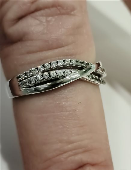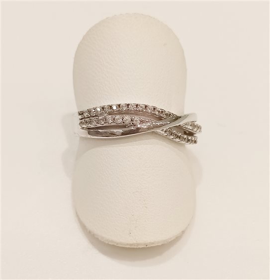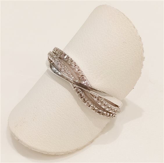 ELEGANTE ANELLO IN ORO BIANCO MODELLO FEDINA INTRECCIATA DA ZIRCONI INCASSATI A GRIFFE E FILO IN ORO BIANCO LISCIO.