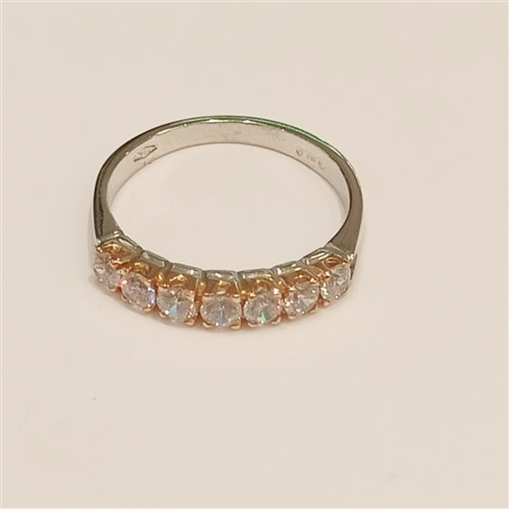 ELEGANTE ANELLO IN ORO BIANCO MODELLO RIVIERA CON ZIRCONI INCASSATI A GRIFFE SU CASTONE IN ORO ROSA.