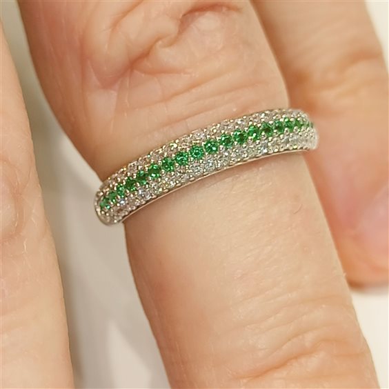 ELEGANTE ANELLO IN ORO BIANCO CON ZIRCONI INCASSATI A GRIFFE COLOR BIANCO E VERDE.