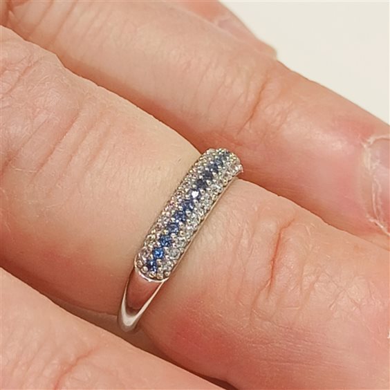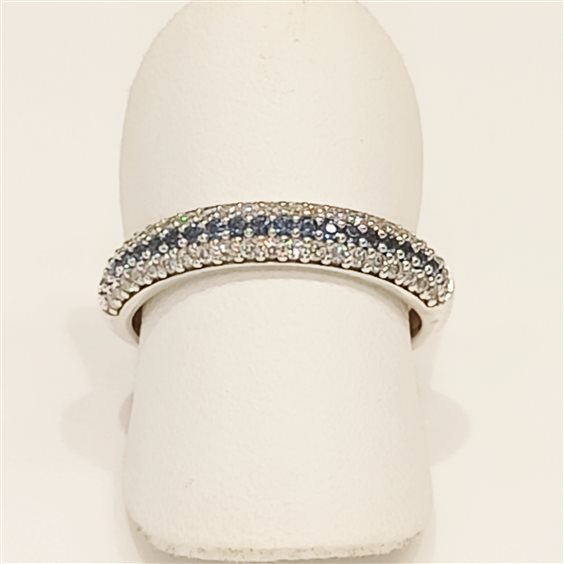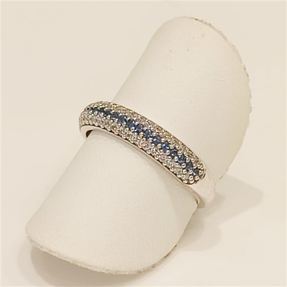 elegante anello in oro bianco con zirconi bianchi e blu incassati a griffe.