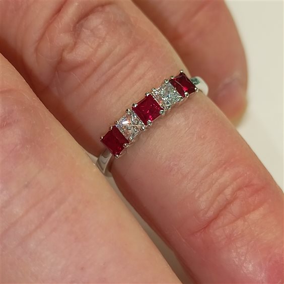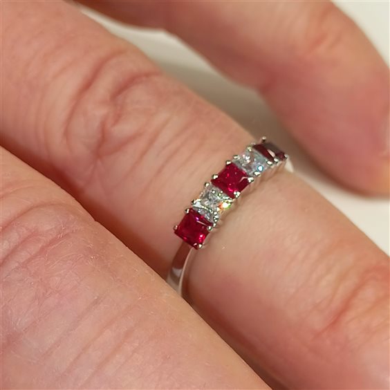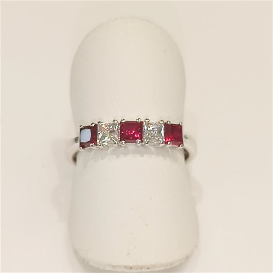 Elegante anello modello riviera in oro bianco con zirconi bianchi e rossi incassati a griffe.