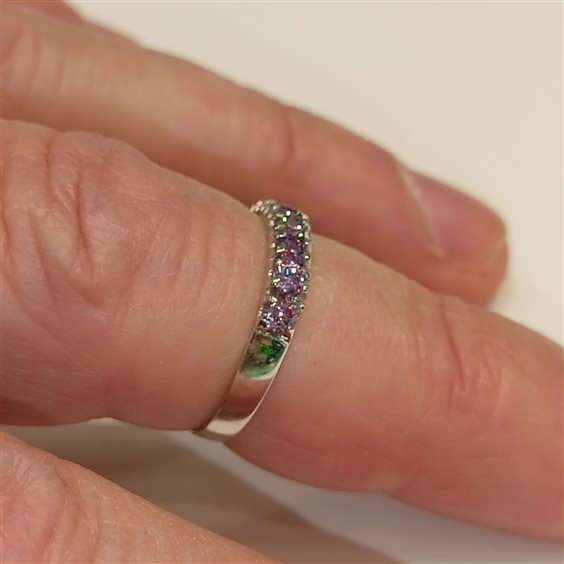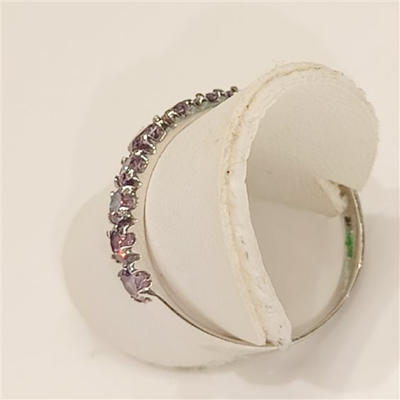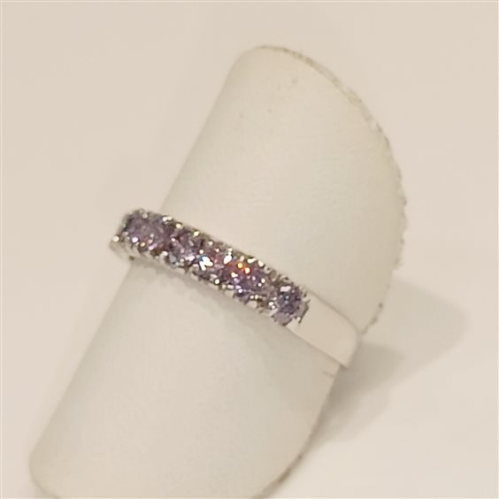 Elegante anello in oro bianco modello riviera con zirconi color lilla incassati a griffe.
