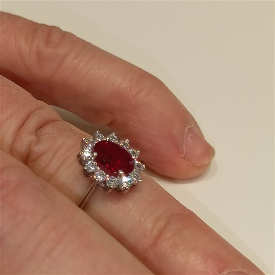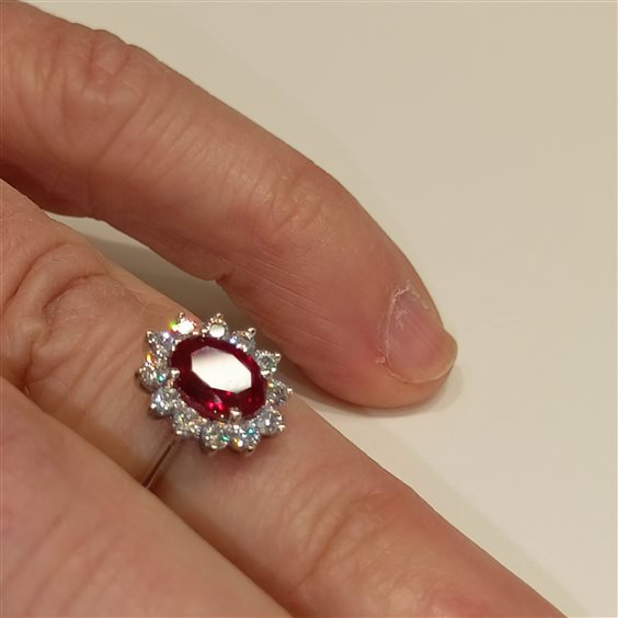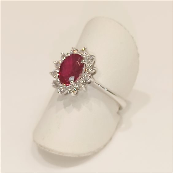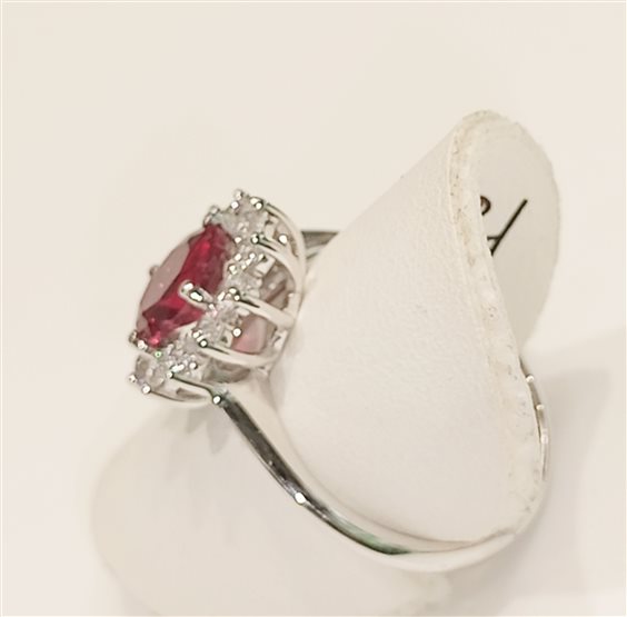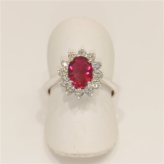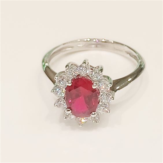 Elegante anello in oro bianco modello KATE con zircone centrale colore rosso rubino e zirconi a contorno bianchi, tutti incassati a griffe.