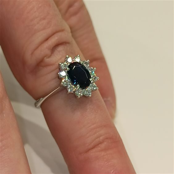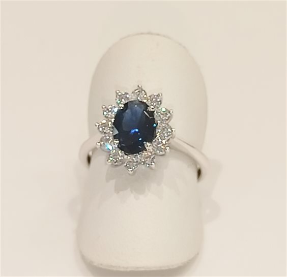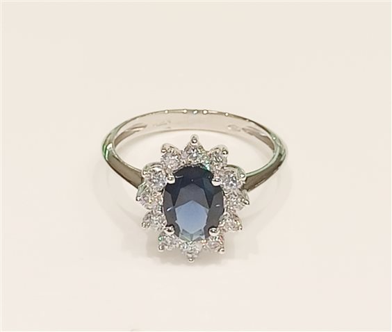 Elegante anello in oro bianco modello KATE con zircone centrale color blu zaffiro e zincorni bianchi a contorno tutto incassato a griffe.