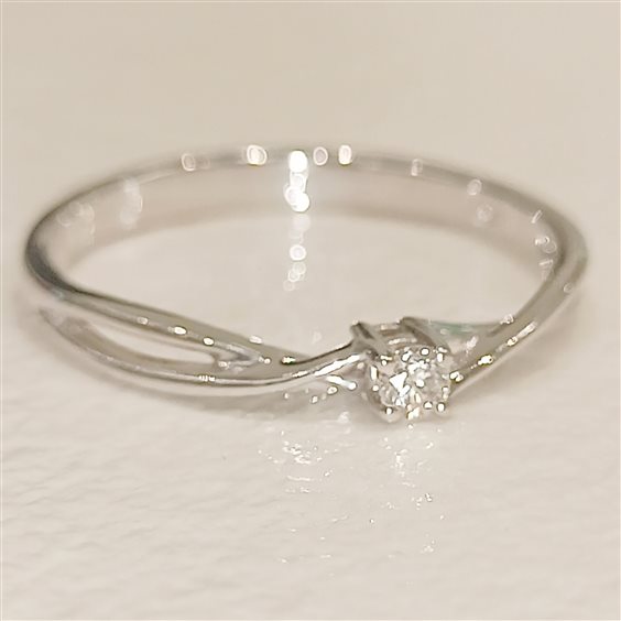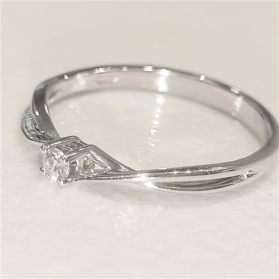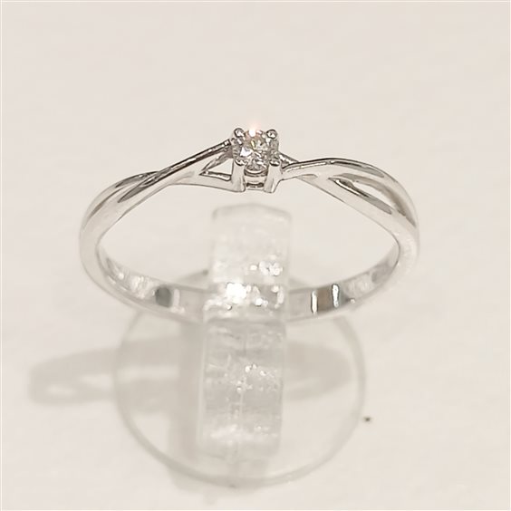 ELEGANTE ANELLO SOLITARIO IN ORO BIANCO CON DIAMANTE TAGLIO BRILLANTE SU CASTONE INCASSATO A GRIFFE. Montatura sagomata movimento di design ad intreccio.