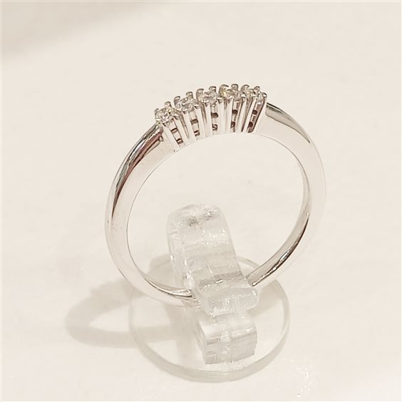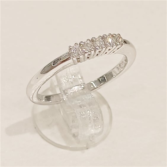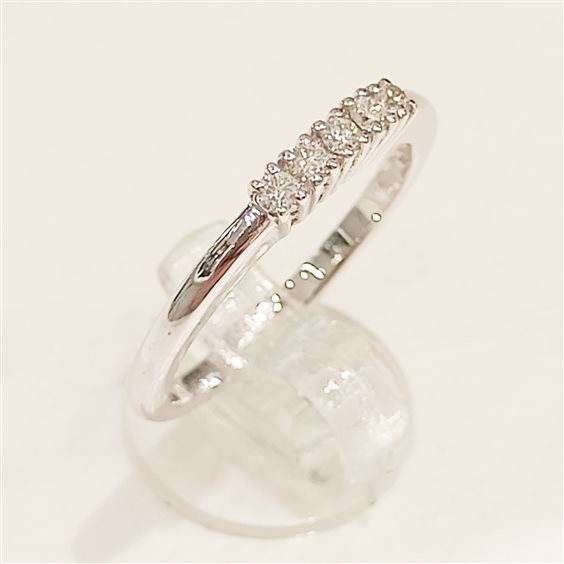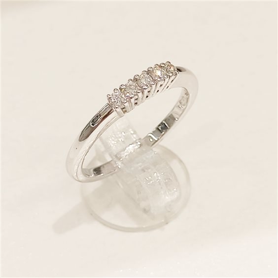 ELEGANTE ANELLO "RIVIERE" IN ORO BIANCO CON CINQUE DIAMANTI TAGLIO BRILLANTE INCASSATI SU CASTONE LEGGERMENTE RIALZATO A GRIFFE.