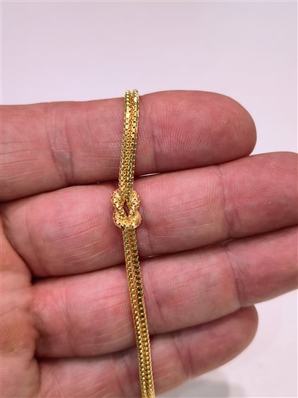 GRAZIOSO E MODERNO BRACCIALETTO IN ARGENTO DORATO MAGLIA CODA DI TOPO E AL CENTRO NODO D'AMORE INTRECCIATO, CATENINA SUL FINALE PER VARIE MISURE.
