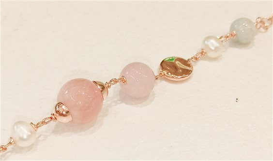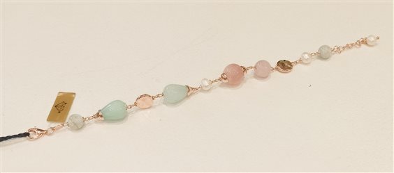 Elegante e molto bello bracciale in argento con pietre dure bicolor rosa e azzurro, perle bianbhe e particolari a cerchio schiacciato e battuto .