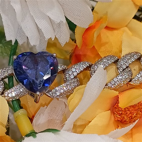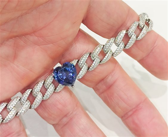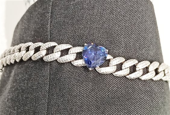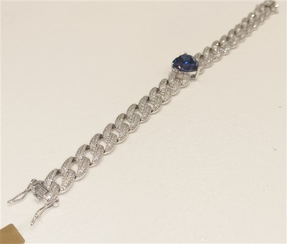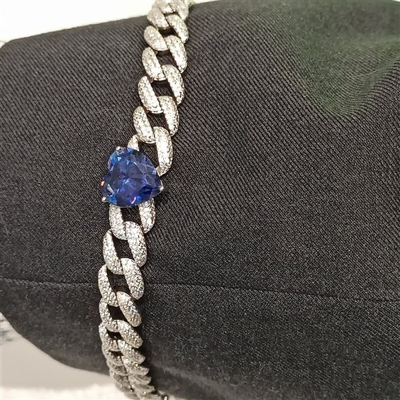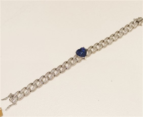 ELEGANTE BRACCIALE A CATENA COPERTO DI ZIRCONI BIANCHI INCASSATI A GRIFFE, PIETRA CENTRALE A FORMA DI CUORE COLORE BLU INCASSATA A TRE GRIFFE.