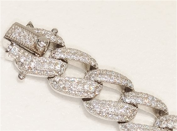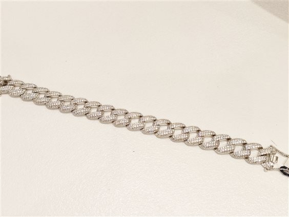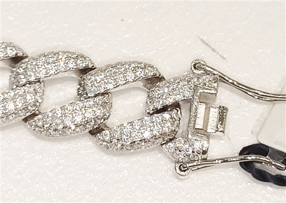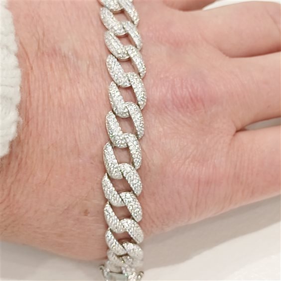 ELEGANTE BRACCIALE IN ARGENTO MAGLIE LARGHE A CATENA COMPLETAMENTE RINVESTITE DI ZIRCONI INCASSATI A GRIFFE, CHIUSURA A CASSETTA CON DUE SICURE AI LATI A "OTTO"