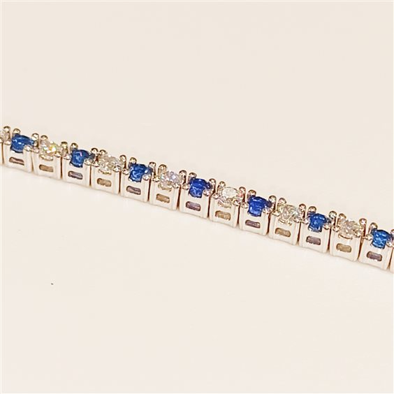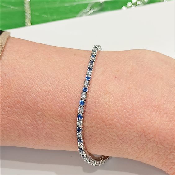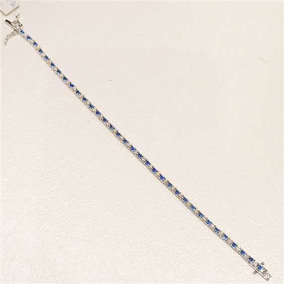 BRACCIALE TENNIS IN ARGENTO E ZIRCONI COLORATI BLU E BIANCO, CHIUSURA A CASSETTA CON SICURA A "OTTO" AI DUE LATI.