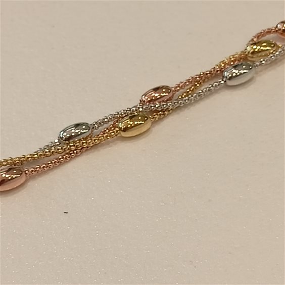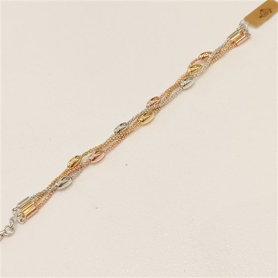 ELEGANTE BRACCIALE IN ARGENTO A TRE COLORI, GIALLO,ROSA,BIANCO CON PARTICOLARI A OLIVETTA INTERVALLATI SU CATENA ARROTONDATA.
