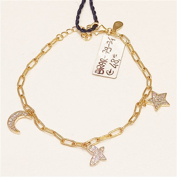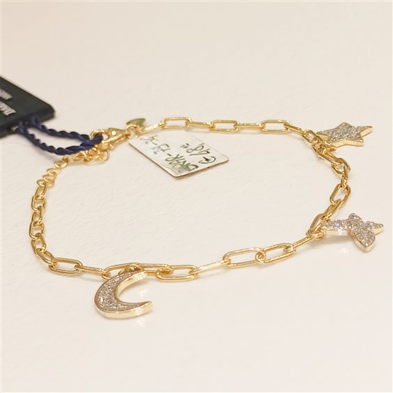GRAZIOSO BRACCIALETTO IN ARGENTO DORATO CON TRE PENDENTI A FORMA DI STELLA, FARFALLA E LUNA. SOPRA OGNUNO, PICCOLI ZIRCONI INCASSATI A GRIFFE.