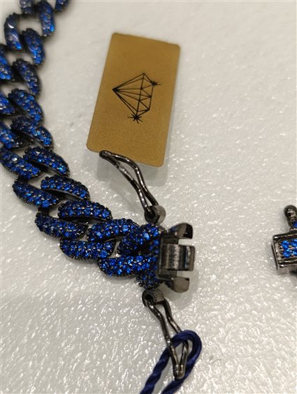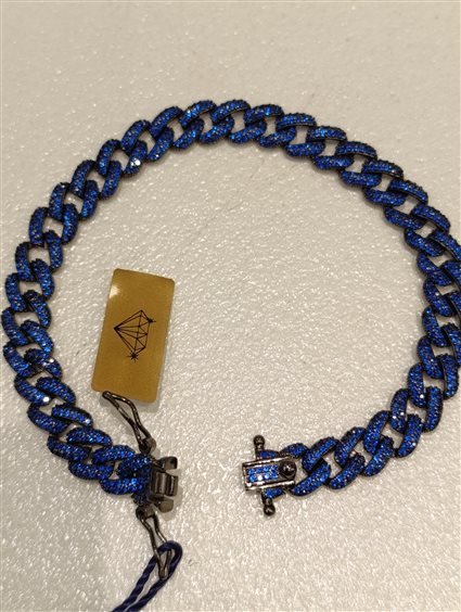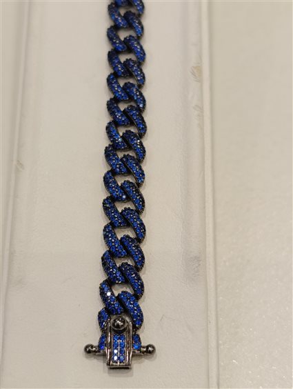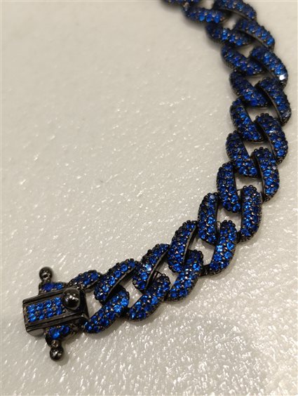 ELEGANTE E PREZISO BRACCIALE IN ARGENTO COLOR ANTRANCITE CON ZIRCONI BLU INCASSATI A GRIFFE. CHIUSURA A CASSETTA CON DUE SICURE AI LATI A FORMA DI "OTTO".