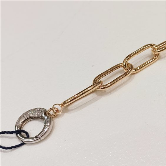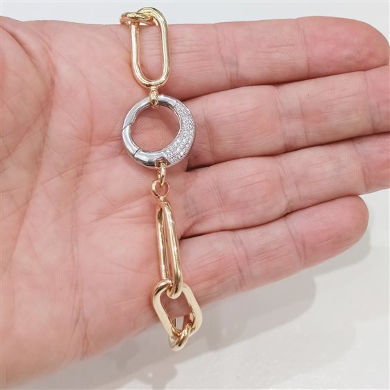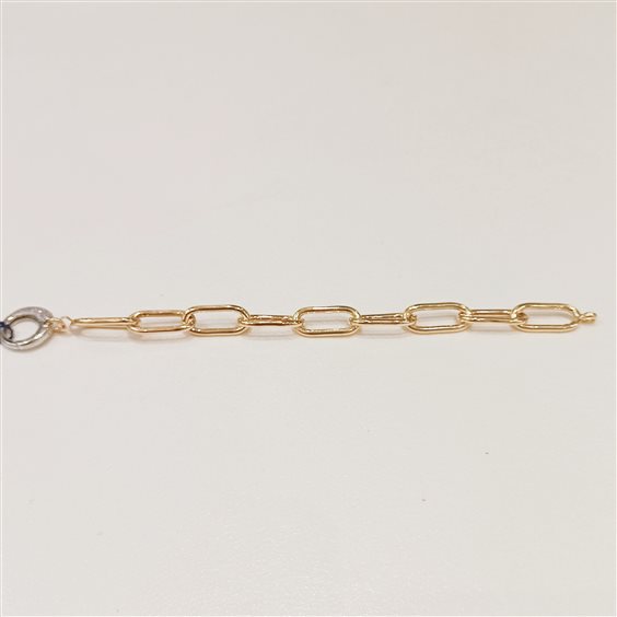 ELEGANTE BRACCIALE IN ARGENTO LAMINATO ORO, PREZIOSA CHIUSURA A MOSCHETTONE GRANDE IN ARGENTO BIANCO CON ZIRCONI INCASSATI A GRIFFE SU AMBO DUE I LATI.