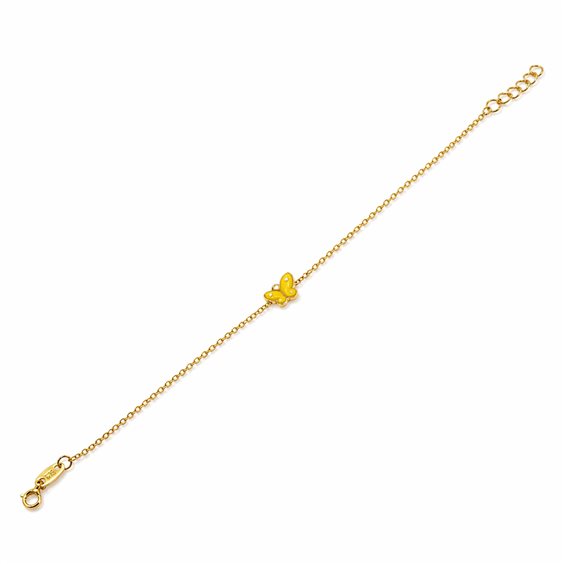 GIOVANE E GRAZIOSO BRACIALETTO IN ORO GIALLO 9KT, CATENINA A PICCOLI ANELLI CON AL CENTRO UNA FARFALLINA SMALTATTA COLOR GIALLO E BIANCO.