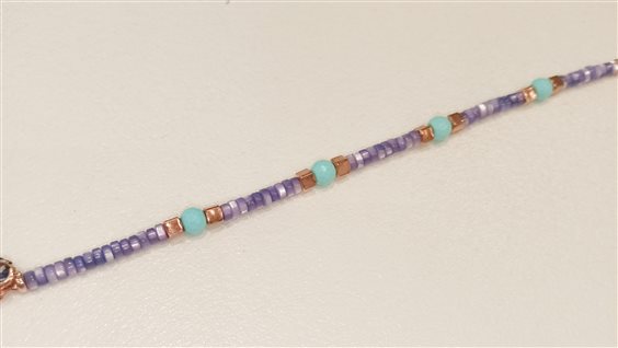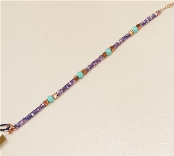 Bracciale unisex in argento rosa con pietre color ametista e turchesi. particolari in argento rosa tra le pietre.