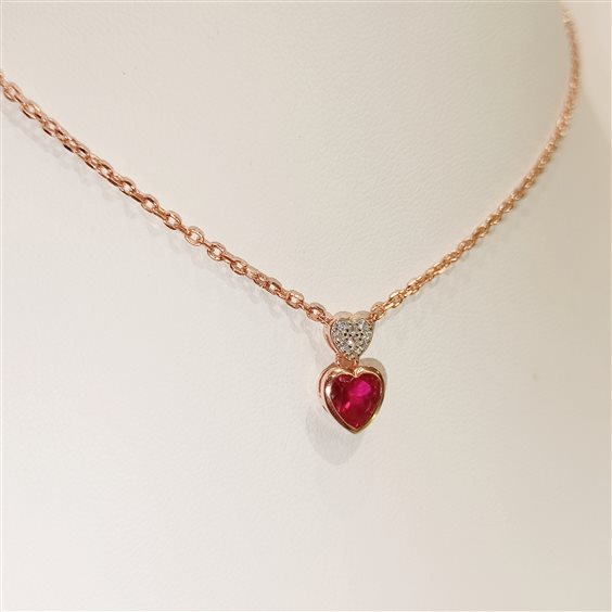 ELEGANTE COLLANA IN ARGENTO ROSA CON PENDENTE A FORMA DI CUORE, PIETRA DI COLORE ROSSO INCASSATA A NOTTE, ZIRCONI BIANCHI INCASSATI A GRIFFE.