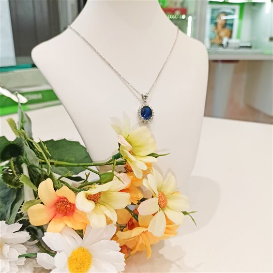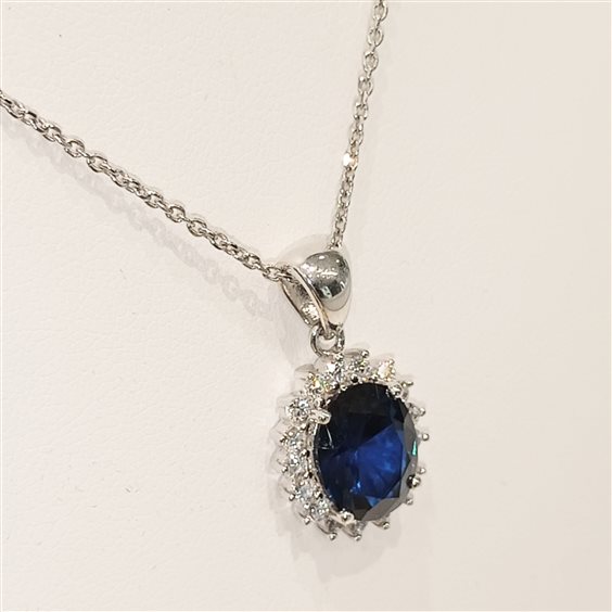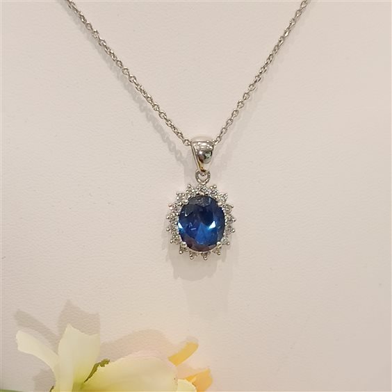 ELEGANTE COLLANA IN ARGENTO CON PENDENTE MODELLO "KATE", PIETRA IN CORNIDONE COLORE BLU, ZIRCONI BIANHI A CONTORNO, TUTTO INCASSATO A GRIFFE.