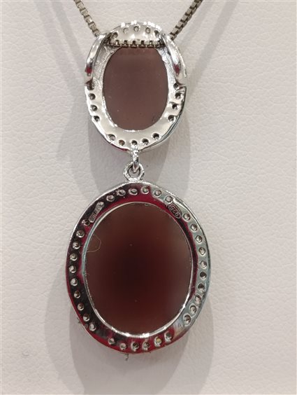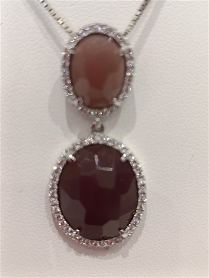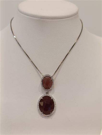 ELEGANTE COLLANA IN ARGENTO MAGLIA VENEZIANA, DUE PENDENTI SOVRAPPOSTI DI DUE DIMENSIONI, DI PIETRA CORNIOLA COLOR NOCCIOLA OVALI CON CONTORNO IN ZIRCONI INCASSATI A GRIFFE.