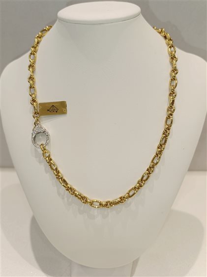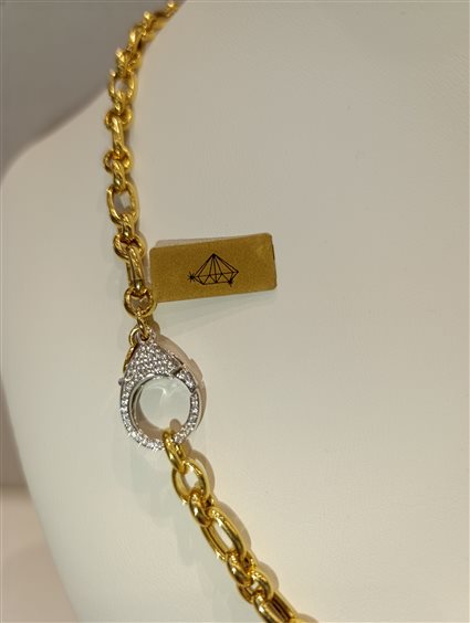 ELEGANTE E PREZIOSA COLLANA IN ARGENTO COLOR GIALLO A CATENA (DUE PIU UNO). GRANDE GANCIO PER CHIUSURA CON ZIRCONI BIANCHI INCASSATI A GRIFFE DA AMBO I LATI. CON CODICE BRAR-90-34 DISPONIBILE ANCHE IL BRACCIALE IN PARURE.