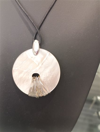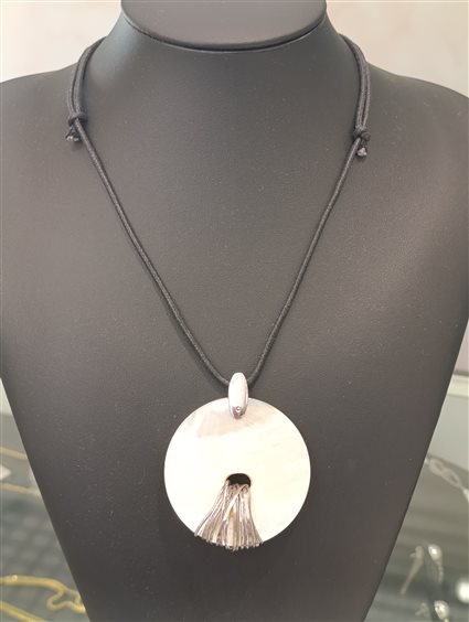 BELLISSIMO PENDENTE IN MADREPERLA DALLA FORMA ROTONDA CON PARTICOLARE DI UN FILO SEMIPIATTO IN ARGENTO RITORTO ALLA BASE E SU DI UN FORO CENTRALE, CONTROMAGLIA IMPORTANTE SEMPRE IN ARGENTO DA POTER SCEGLIERE SE USARE CON CATENINA (NON COMPRESA NEL PREZZO ) O CORDONCINO IN COTONE CERATO.
