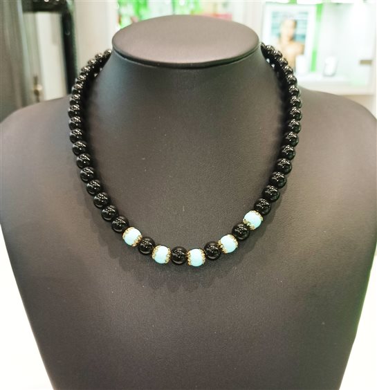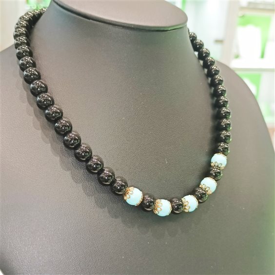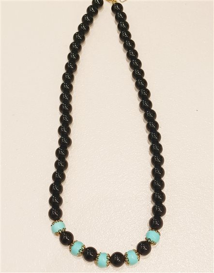 ELEGANTE COLLA IN ONICE E TURCHESE CON INSERTI E GANCIO IN ARGENTO DORATO,