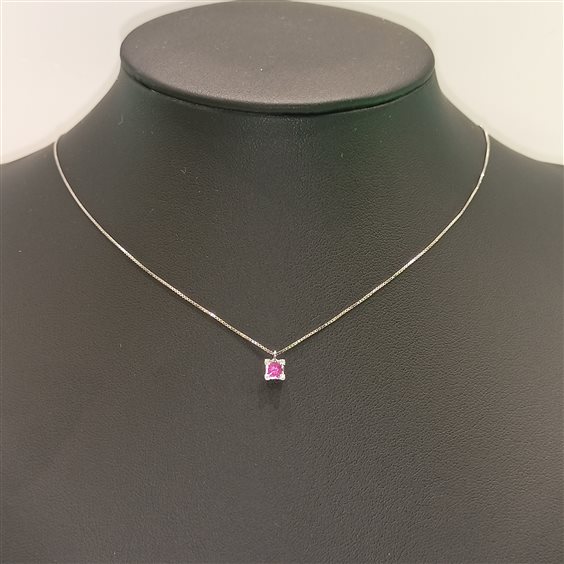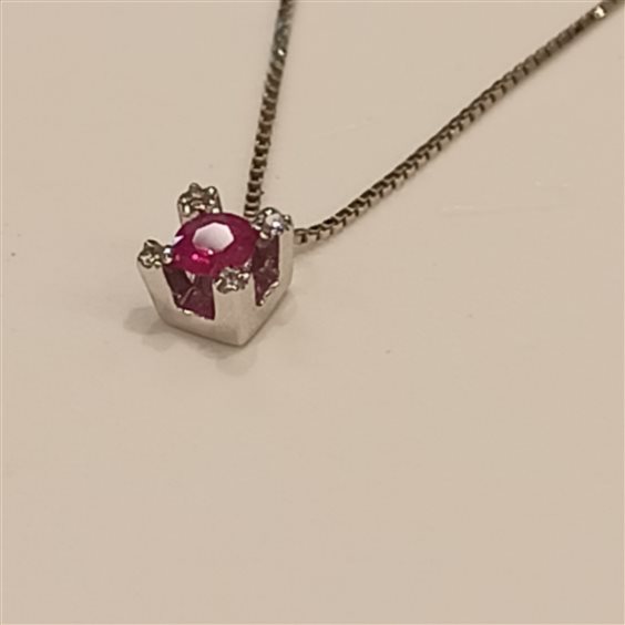 ELEGANTE COLLANA IN ORO BIANCO CON RUBINO INCASSATO A GRIFFE E SU OGNIUNA DI QUESTE, UN DIAMANTINO SEMPRE INCASSATO A GRIFFE ,
