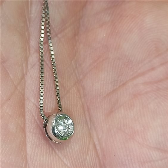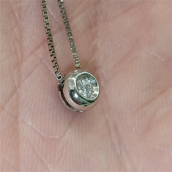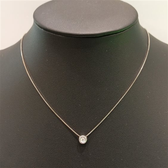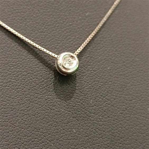 ELEGANTE COLLANA IN ORO BIANCO CON PENDENTE PASSANTE, DIAMANTE TAGLIO BRILLANTE INCASSATO A NOTTE.
