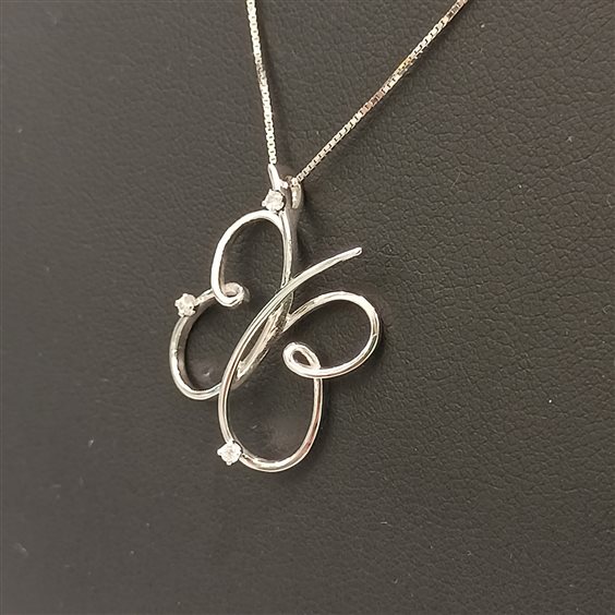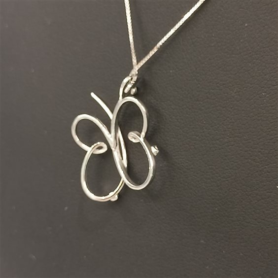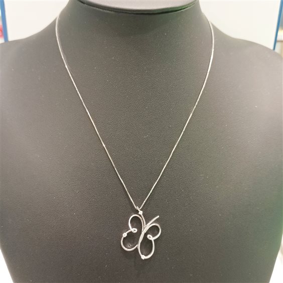 ELEGANTE COLLANA IN ORO BIANCO CON PENDENTE A FORMA DI FARFALLA E TRE BRILLANTINI INCASSATI A GRIFFE NEL PERIMETRO.