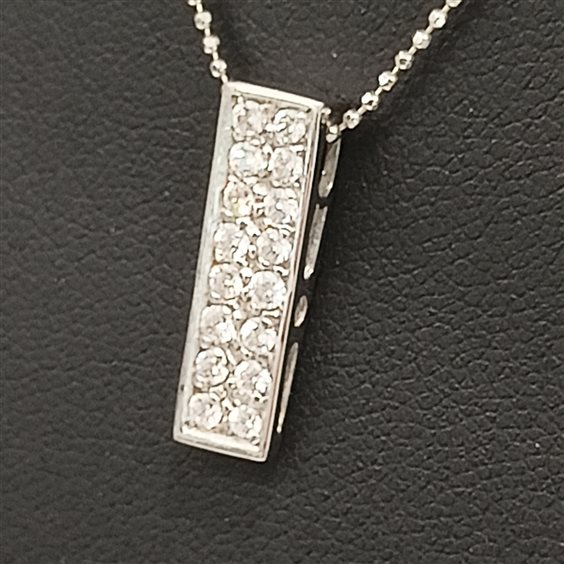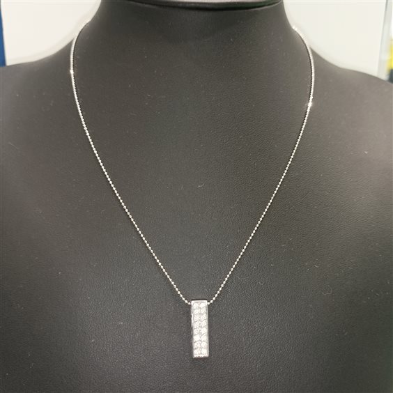 ELEGANTE COLLANA IN ORO BIANCO CON PENDENTE A FORMA DI RETTANGOLO CON DUE BINARI DI ZIRCONI INCASSATI A GRIFFE.