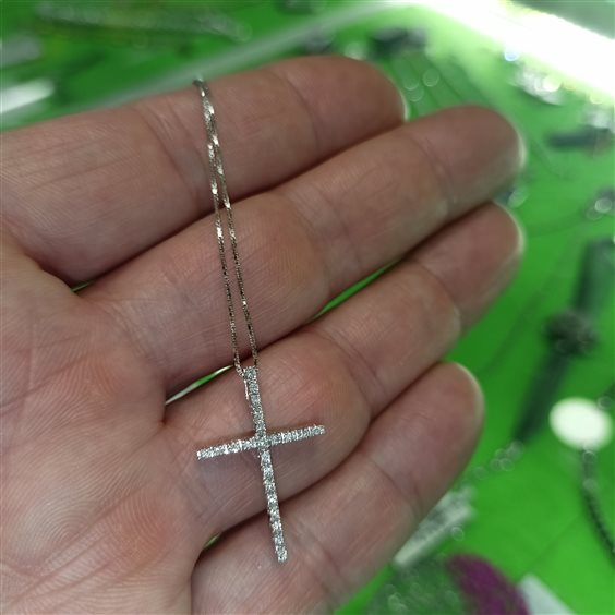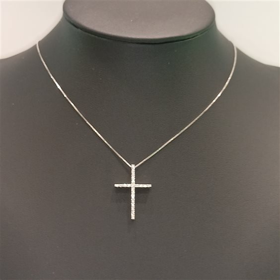 ELEGANTE COLLANA IN ORO BIANCO, PENDENTE A CROCE CON DIAMANTINI TAGLIO BRILLANTE INCASSATI A GRIFFE.
