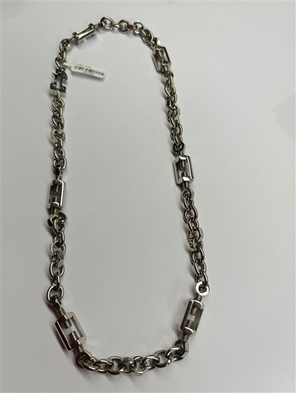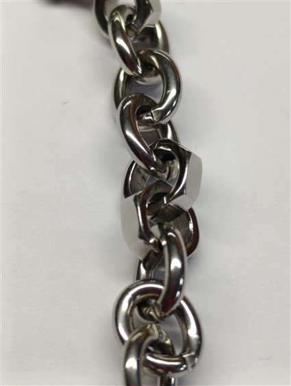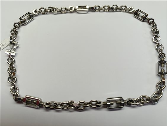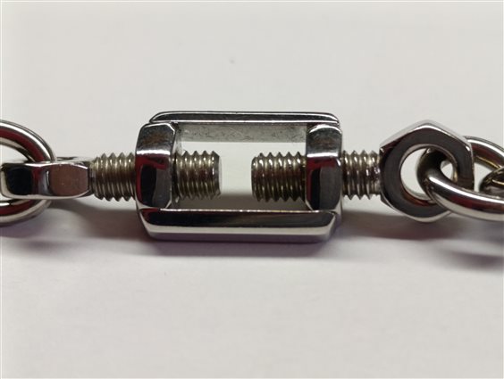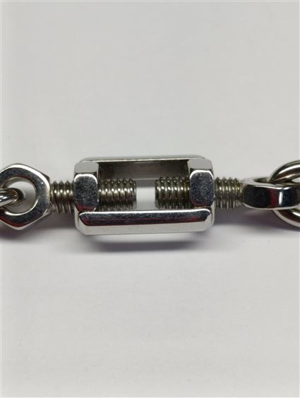 CATENA DA UOMO IN ACCIAIO CON PARTICOLARI A DOPPIA VITE INTERVALLATI CON SPAZI DA 4 CM TRA LORO. GANCIO MOLTO PARTICOLARE A DISEGNO DI NUMERO 1.