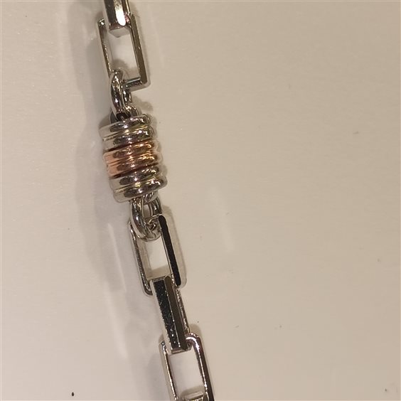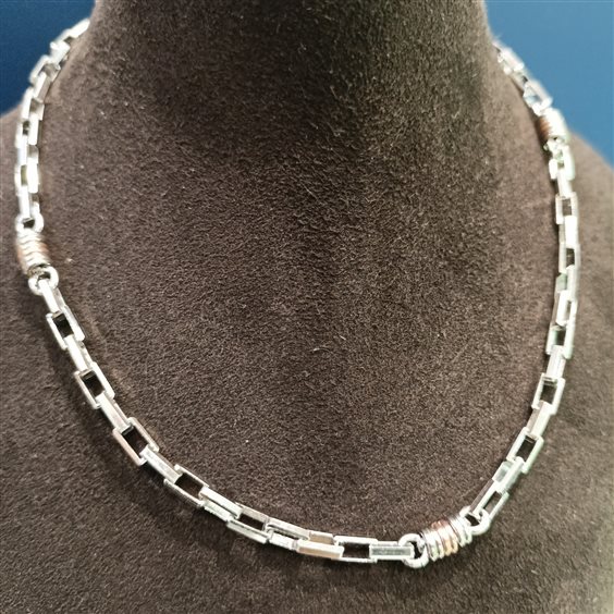 COLLANA IN ARGENTO RODIATO E LUCIDATO A SPECCHIO DA UOMO , CATENA SEZIONE RETTANGOLARE PIATTA, CON PARTICOLARI A CILINDRETTO BICOLORE
