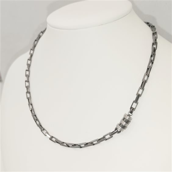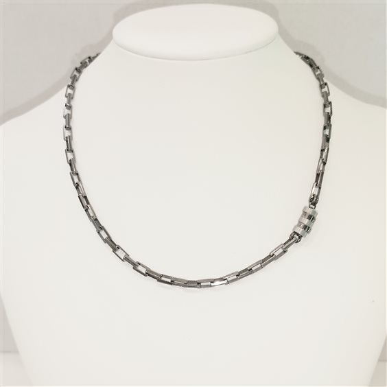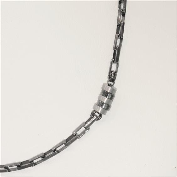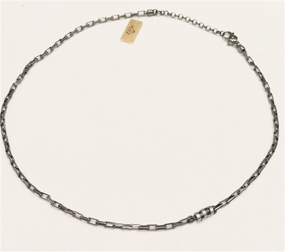 COLLANA IN ARGENTO COLOR ANTRANCITE A MAGLIE DI SEZIONE QUADRA E PIATTA, CON PARTICOLARE A CILINDRETTO SATINATO E LUCIDO AD UN LATO.