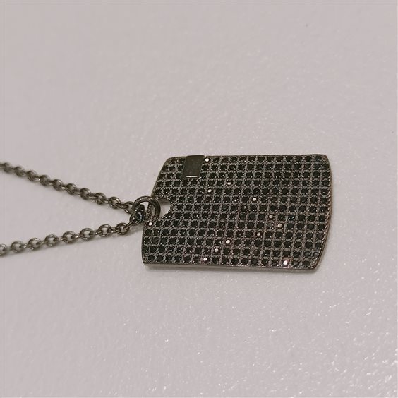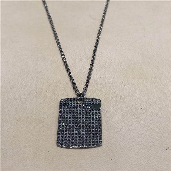COLLANA IN ARGENTO BRUNITO, TARGA RETTANGOLARE CON PICCOLI ZIRCONI NERI INCASSATI A GRIFFE.