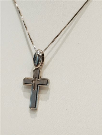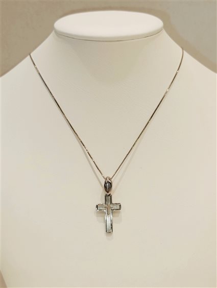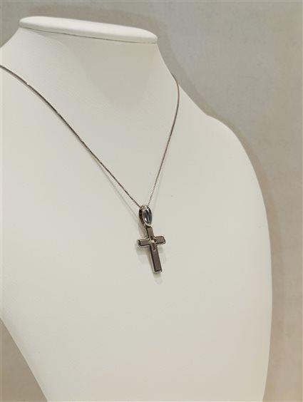 COLLANINA IN ARGENTO RODIATO, CON PENDENTE A FORMA DI CROCE LUCIDA E SATINATA.