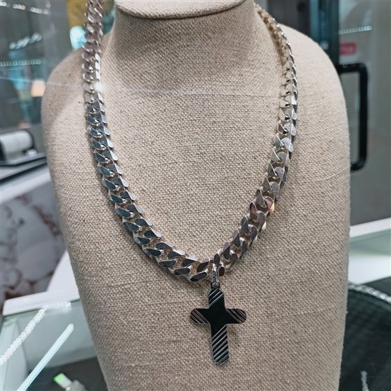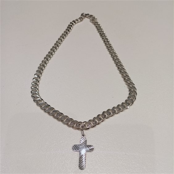 BELLISSIMA COLLANA IN ARGENTO MAGLIA GRUMETTE PIATTA DIAMANTATA CON CROCE PASSANTE PIATTA CON MOTIVI RIGATI INCISI.