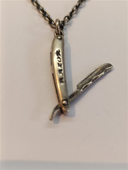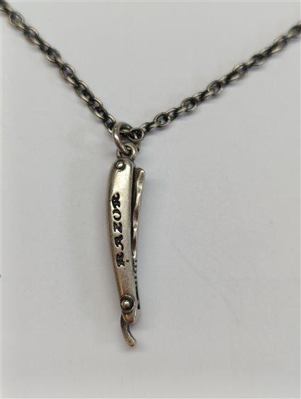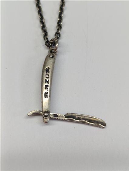 COLLANA DA UOMO IN ARGENTO BRUNITO MODELLO "ROLLO" CON PEBNDENTE A FORMA DI RASOIO CON MANICO .