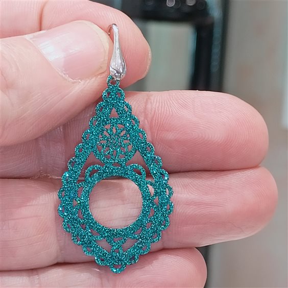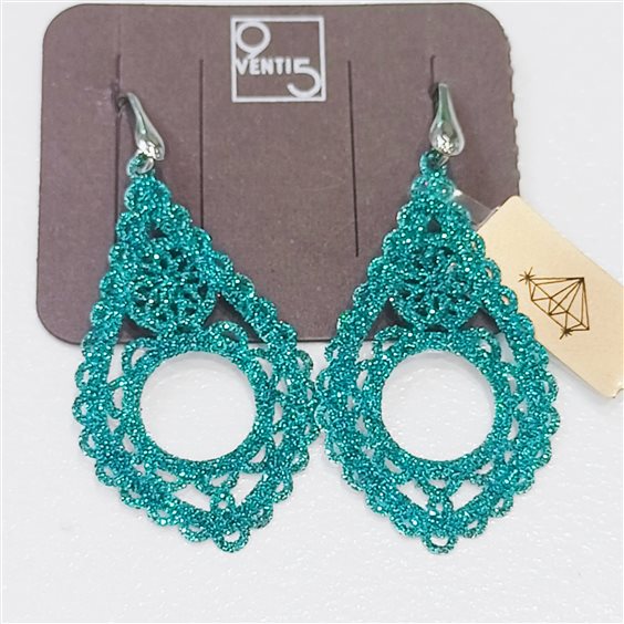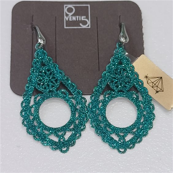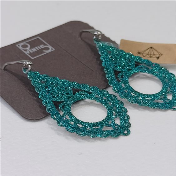 orecchini pendenti tipo lastra sottile e leggeri colore petrolio brillantinato. chiusura con ago aperto.
