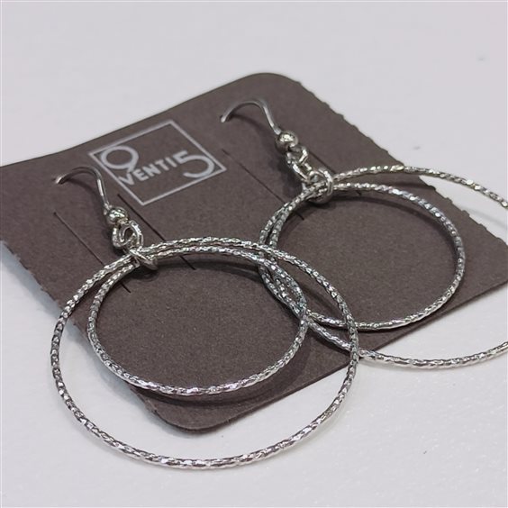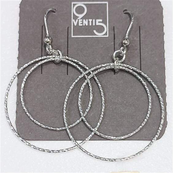 MODERNO ORECCHINO IN ARGENTO CON FANTASIA DI DUE CERCHI PENDENTI UNO ALL'INTERNO DELL'ALTRO DIAMANTATI. CHIUSURA CON AGO APERTO.