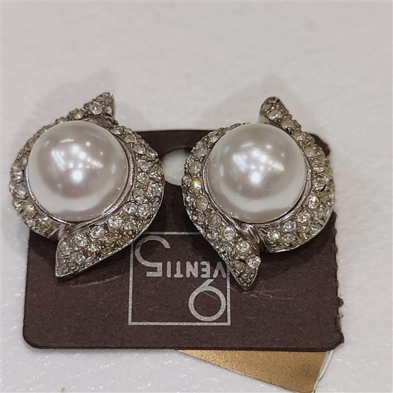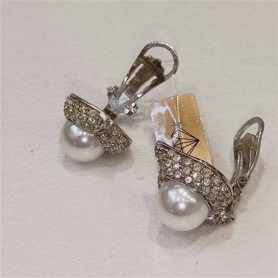 ELEGANTI ORECCHINI IN ARGENTO CON PERLA SINTETICA AL CENTRO DI UN CASTONE DI ZIRCONI INCASSATI A GRIFFE. CHIUSURA A CLIP.