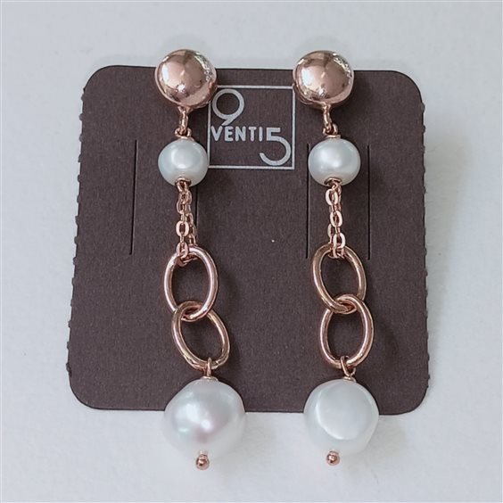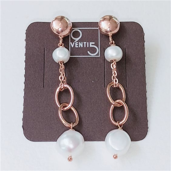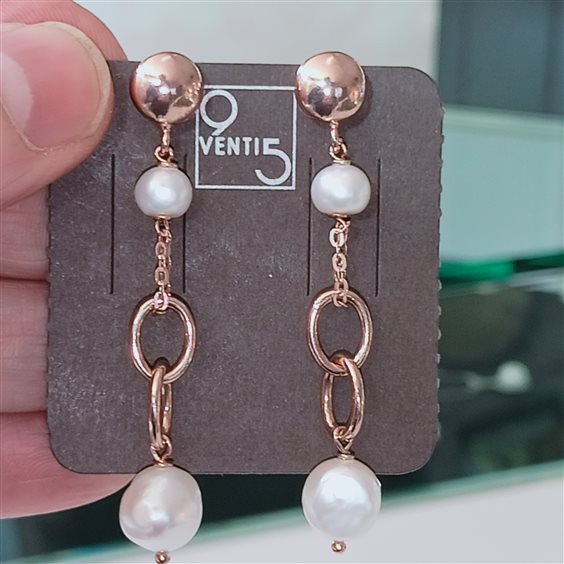 ELEGANTI E PREZIOSI ORECCHINI IN ARGENTO COLOR ROSA CON PERLA D'ACQUA DOLCE BIANCA. PERNO E FARFALLINA. MODELLO PENDENTE LUNGO CM 7.