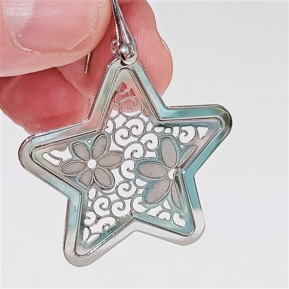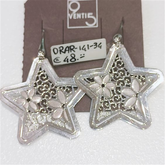 BELLISSIMO ORECCHINO IN ARGENTO RODIATO, TEMA STELLA CON FIORI SU PIASTRA INTARSIATA. GANCIO AD AMO LUNGO.
