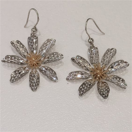 orecchini pendenti a forma di margherita su lastra lavorata e traforata molto leggeri pistillo in argento laminato in oro misura totale dell'orecchino 5 cm.