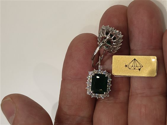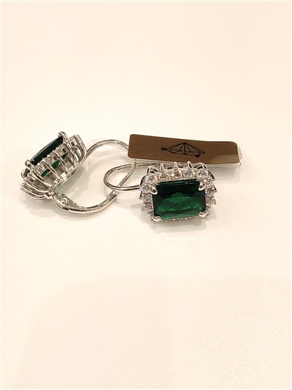 orecchini a monachella di alta qualità con pietra semipreziosa sintesi di corindone taglio smeraldo di colore verde. contorno di zirconi incassati a mano. grandezza generale dell'orecchino 22mm.