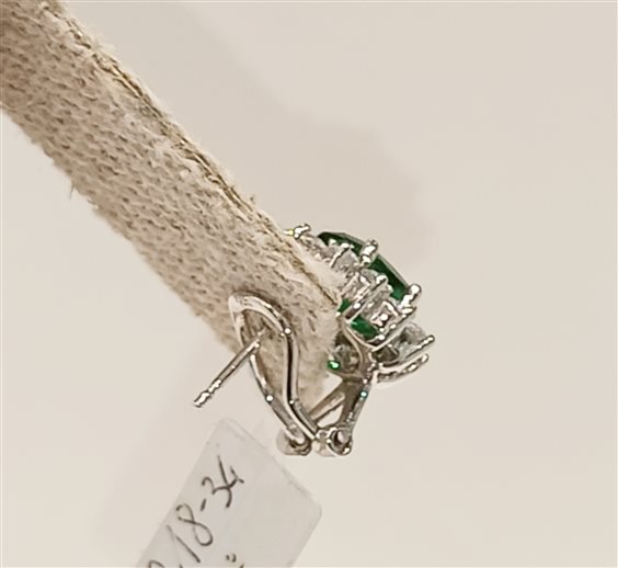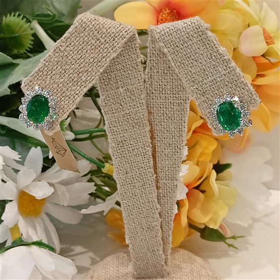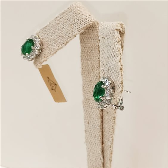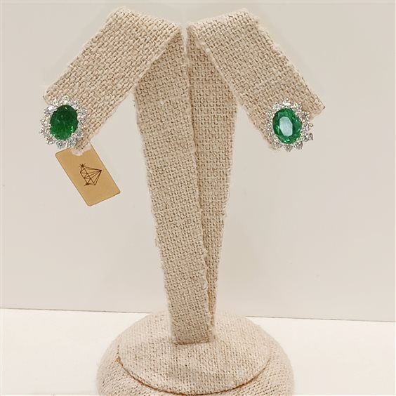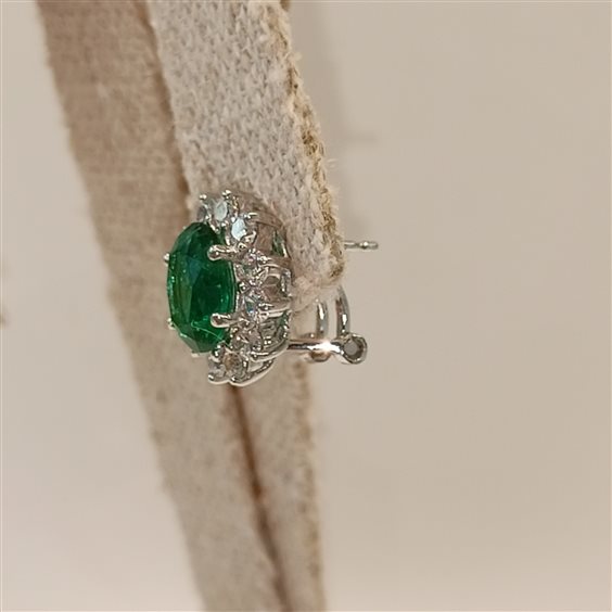 Elegante orecchino al lobo con perno e battente pietra centrale verde e contorno bianco tutto incassato a griffe.
