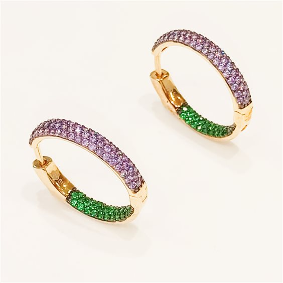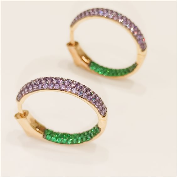 BELL ORECCHINO IN ARGENTO COLOR ORO CON DOPPIA INCASSATURA DI ZIRCONI COLORATI VERDI ALL INTERNO E VIOLA IN ESTERNO.