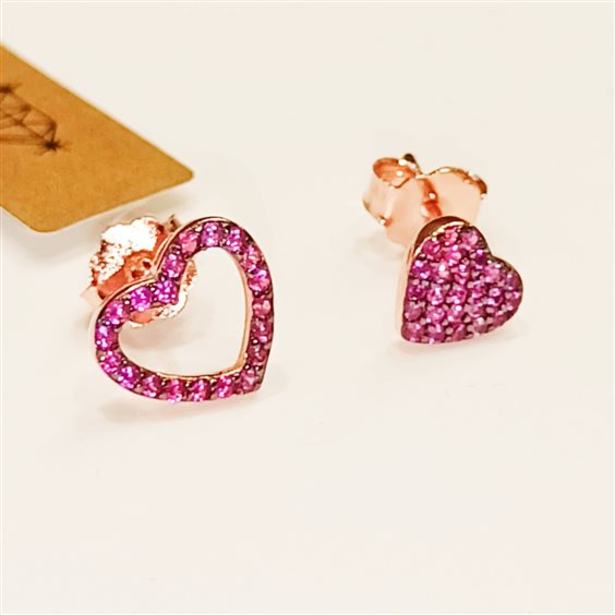 ORECCHINI A LOBO MOTIVO CUORE APERTO SU UNO E CHIUSO SULL ALTRO ZIRCONI INCASSATI COLOR FUCSIA.