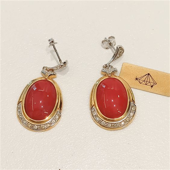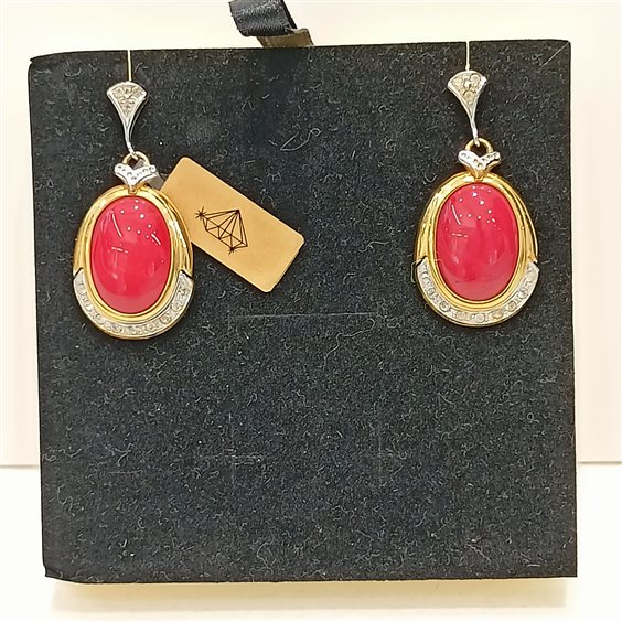 ELEGANTI ORECCHINI PENDENTI IN ARGENTO E PIETRA ROSSA IN PASTA DI CORALLO E ZIRCONI BIANCHI INCASSATI A GRIFFE.
